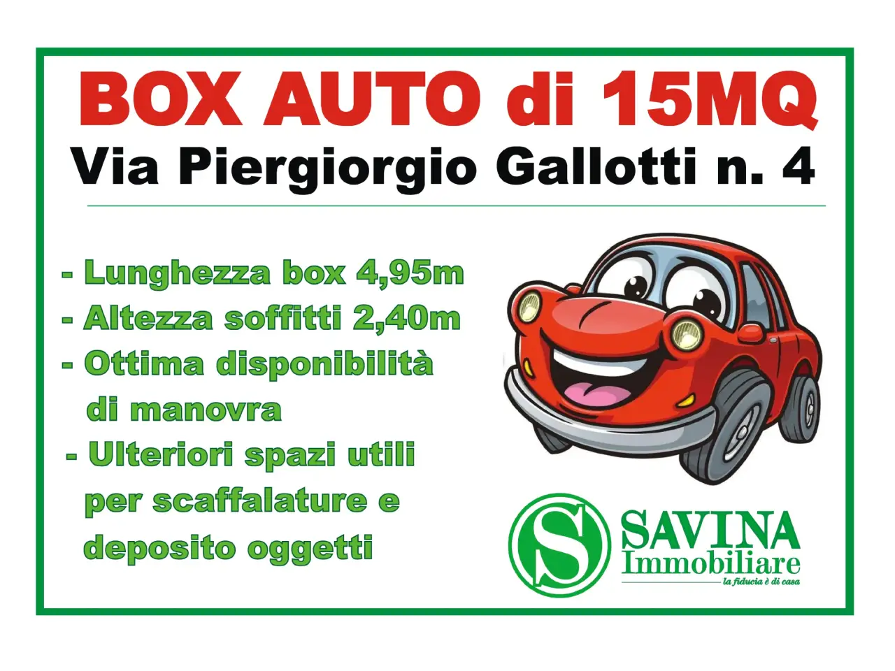 BOX AUTO DI 22MQ VIA PIERGIORGIO GALLOTTI Ubicato in Via Piergiorgio Gallotti, al piano S1 di una palazzina in misto cortina del 2012, proponiamo la vendita di un box auto, con accesso indipendente, di 22 mq con ampia disponibilità di manovra. Box auto della lunghezza di quasi 5 metri, con ulteriori ...